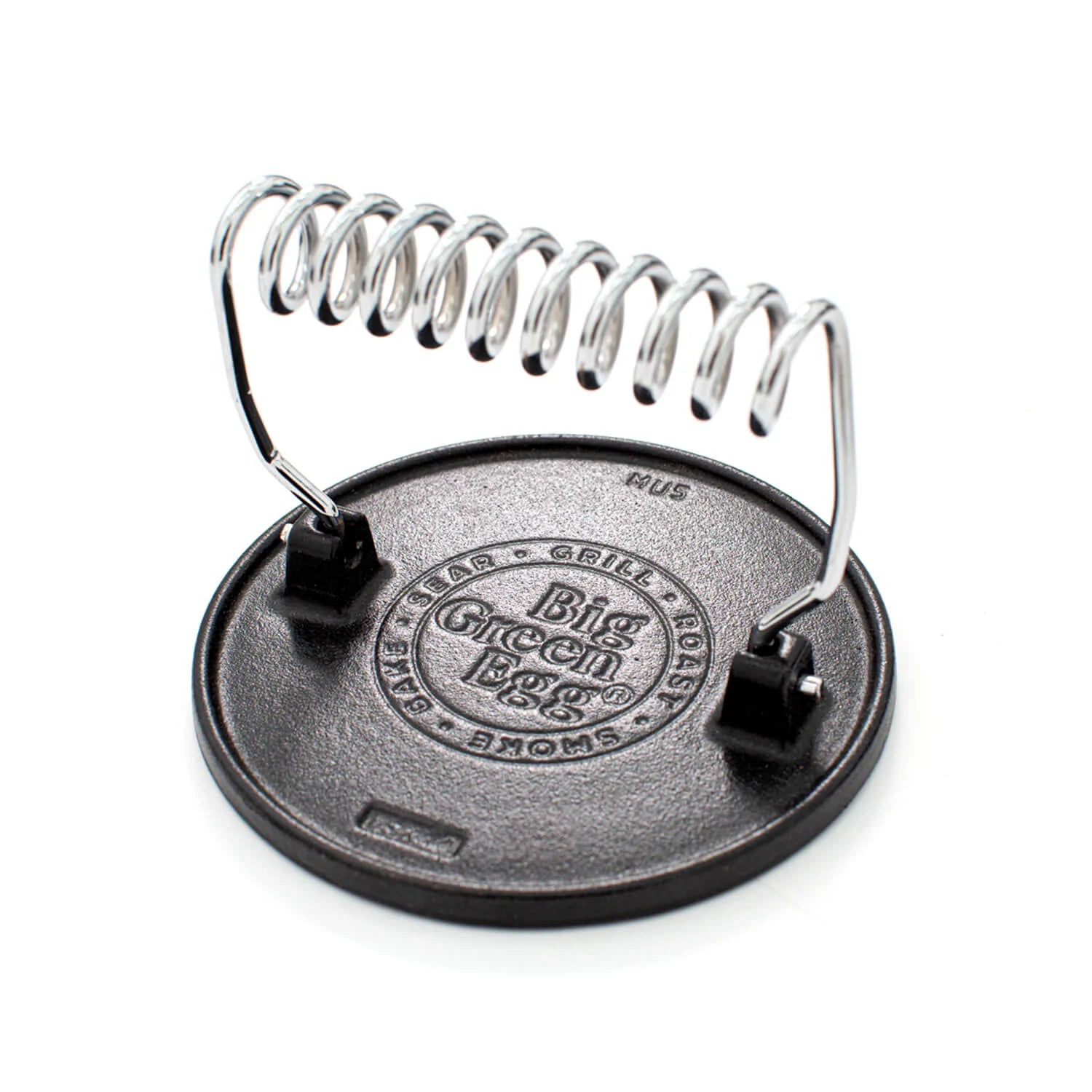 The NEW Big Green Egg Cast Iron Grill Press creates perfect “smash” burgers with crispy edges and a juicy center, and prevents curling when cooking bacon or ham.