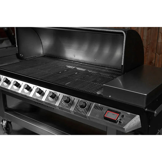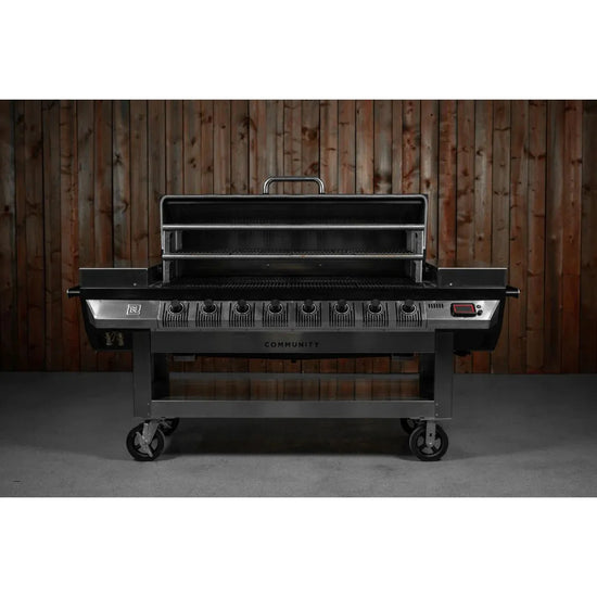 The Black Earth Community Grill is a combination grill that can smoke food with wood pellets or grill with gas with 8 burners. With two pellet hoppers and dual fire, one on each end of the grill, you can easily cook your food to perfection, and create the perfect blend of smoky flavors with ease.