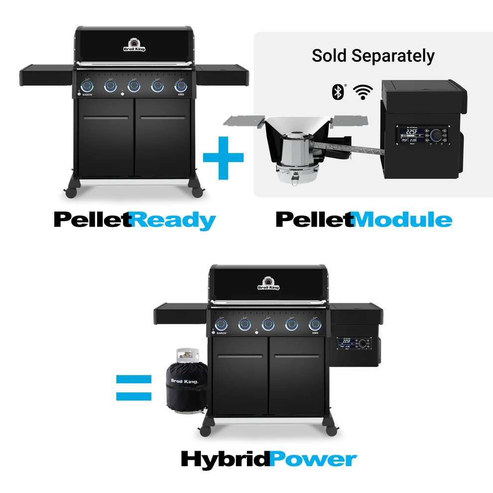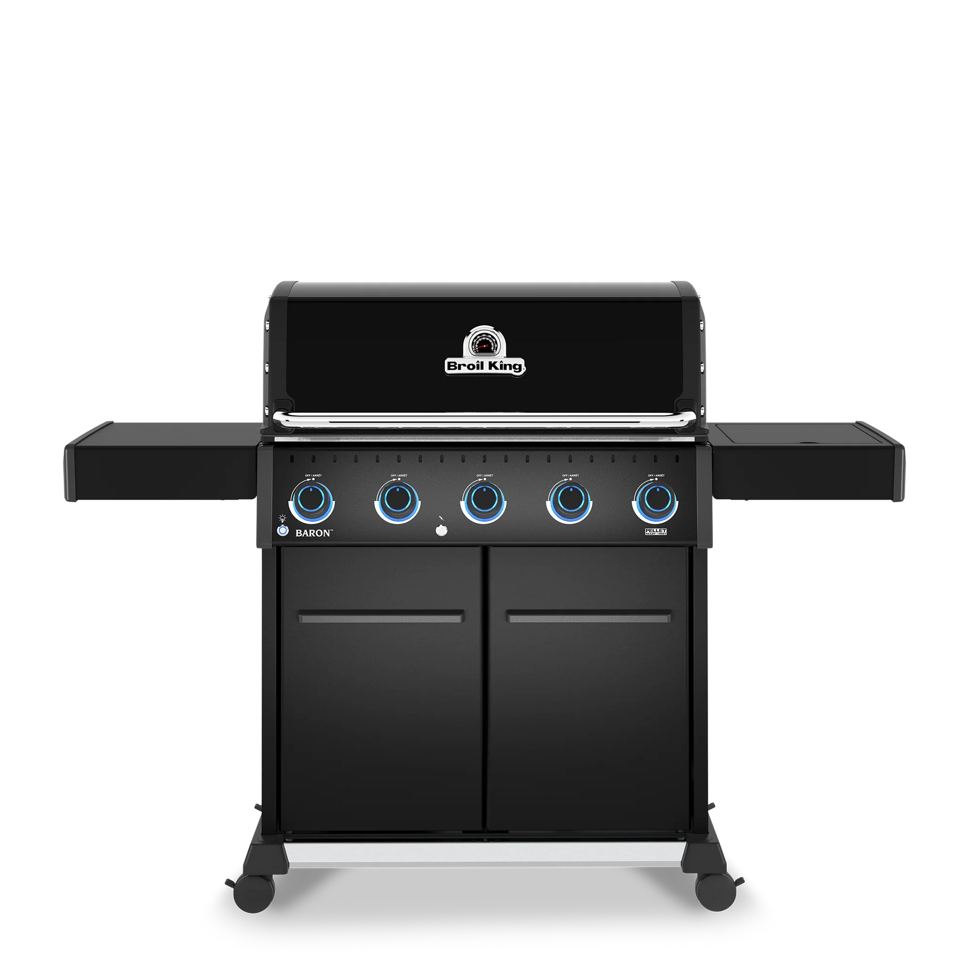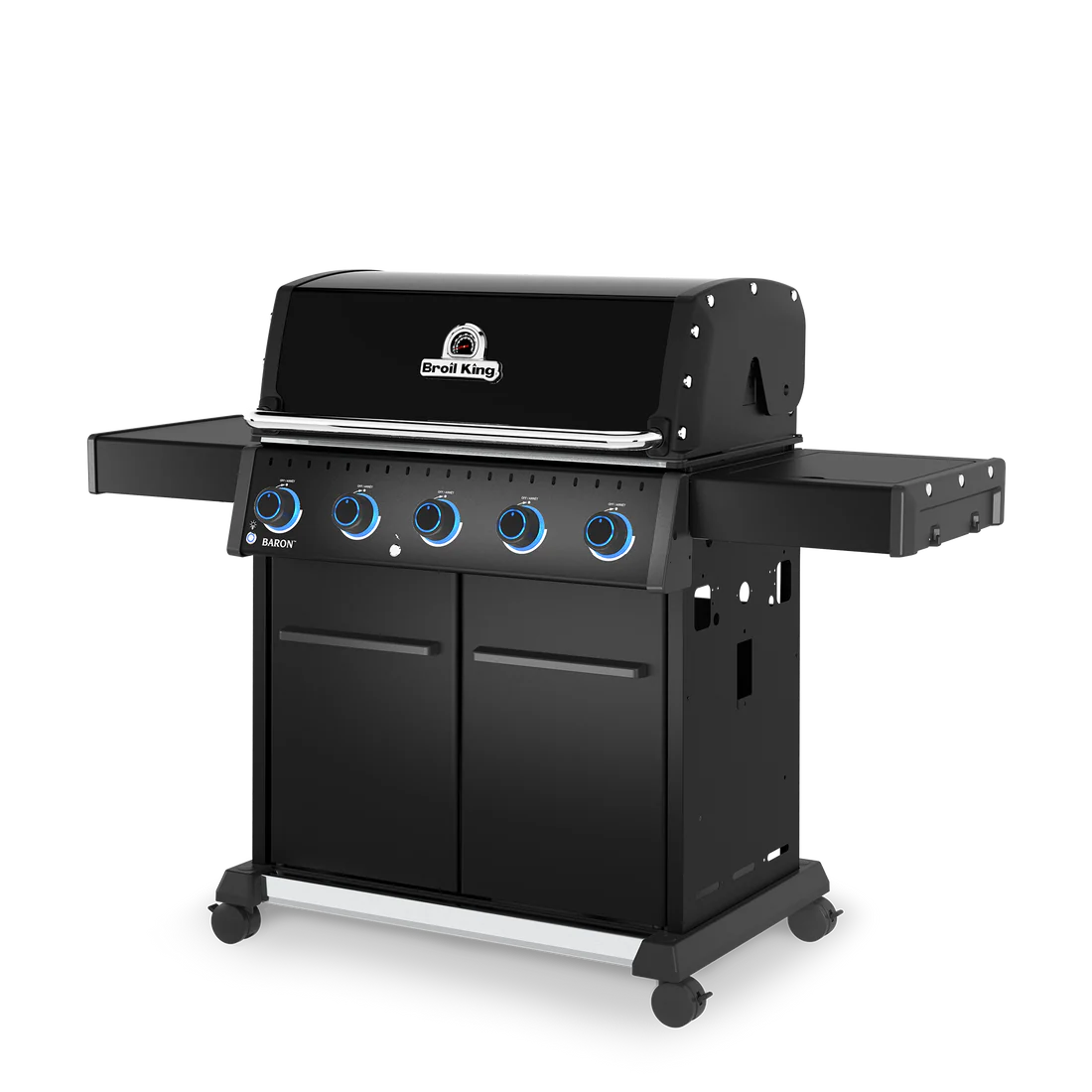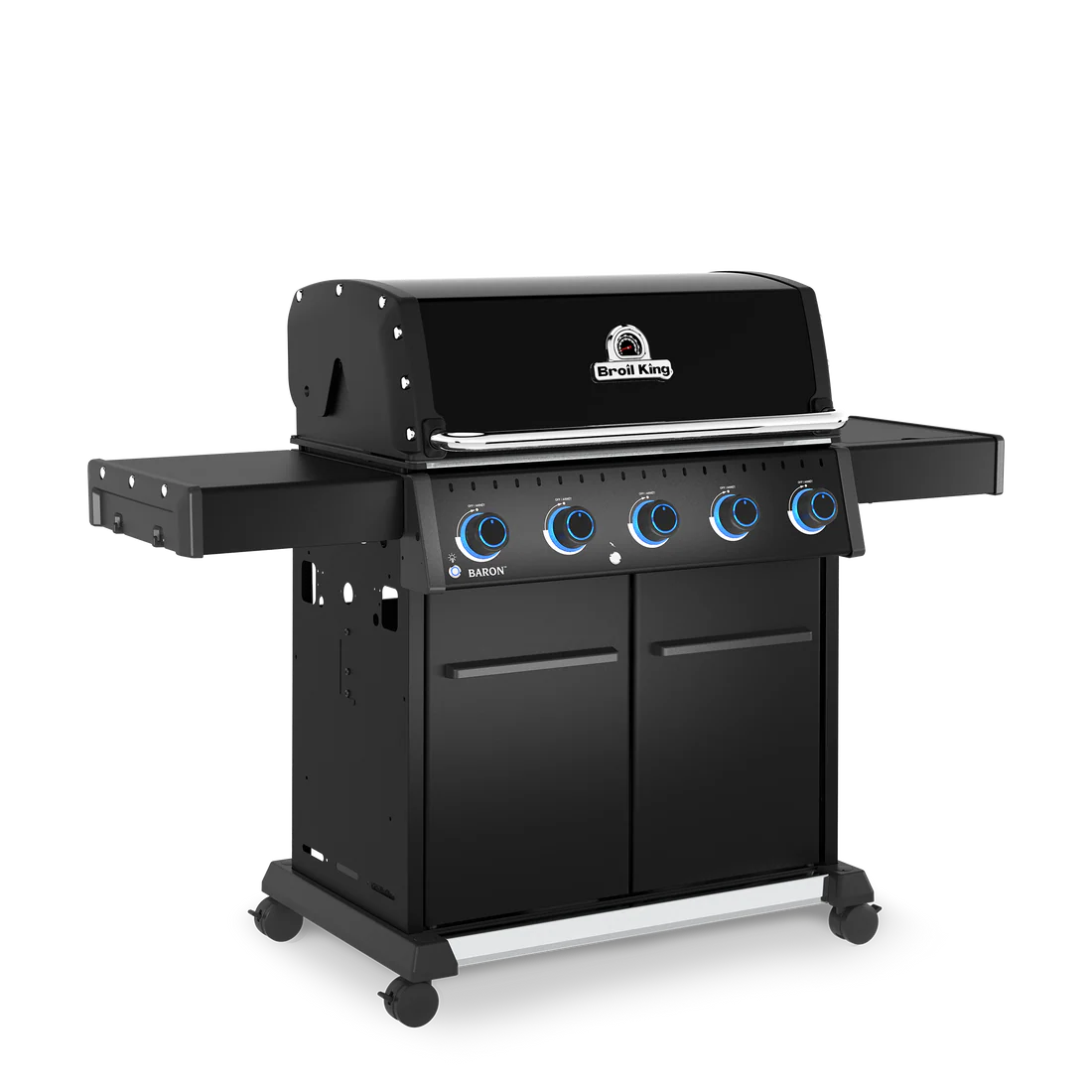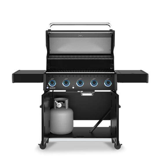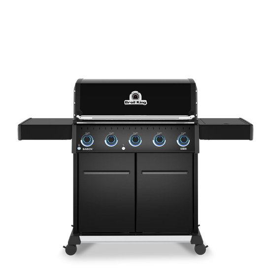 Baron™ 520 PRO features 570 sq. in. primary cooking surface and includes a durable cast aluminum oven, 5 stainless steel Dual-Tube™ burners, illuminated control knobs, stainless steel 8mm rod cooking grids, stainless steel warming rack, stainless steel Flav-R-Wave™ cooking system, electronic ignition, stainless steel drop-down side shelves and enclosed black cabinet base.