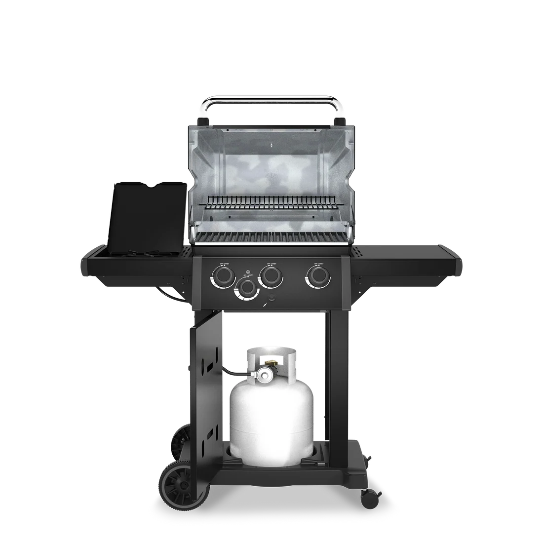 The Royal™ 340 features 335 sq. in. primary cooking surface and includes 3 stainless steel Dual-Tube™ burners, reversible heavy-duty cast iron cooking grids, stainless steel Flav-R-Wave™ cooking system, and electronic ignition.