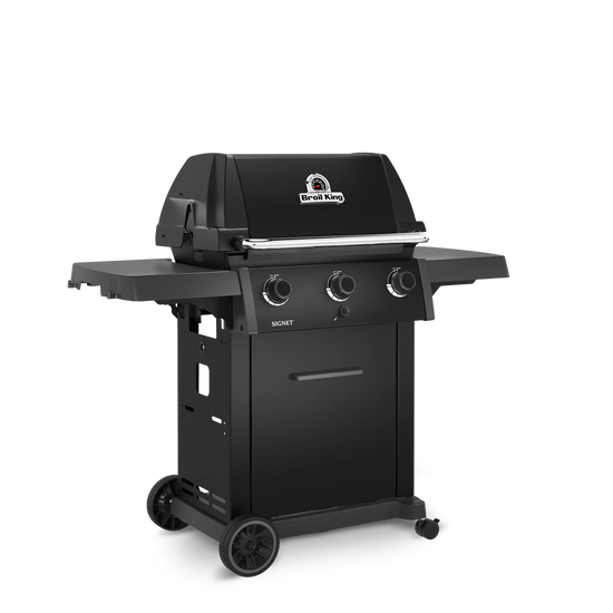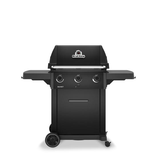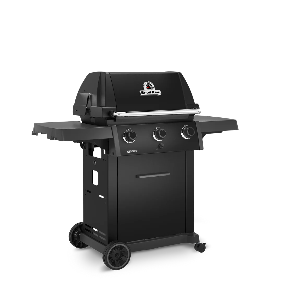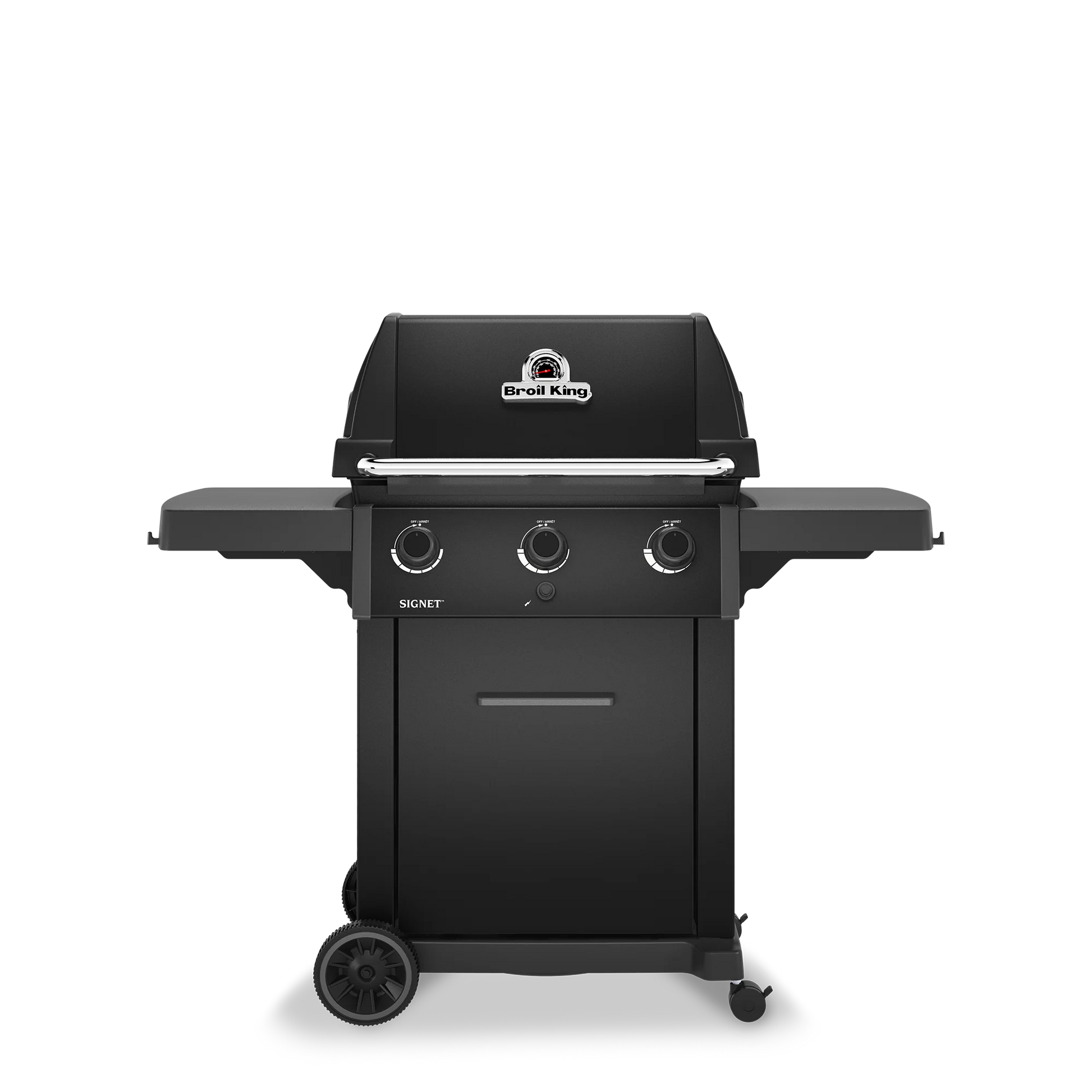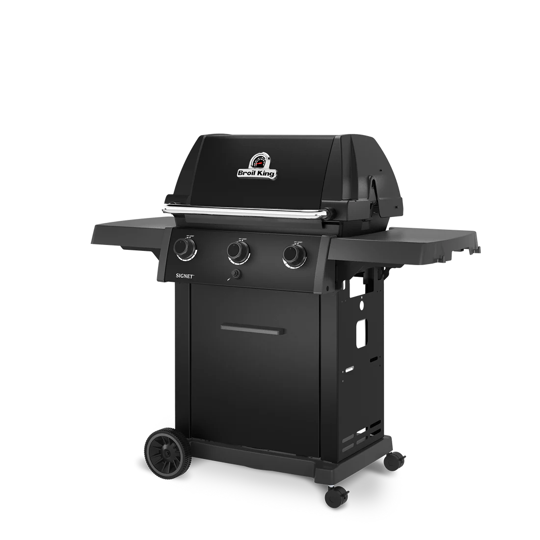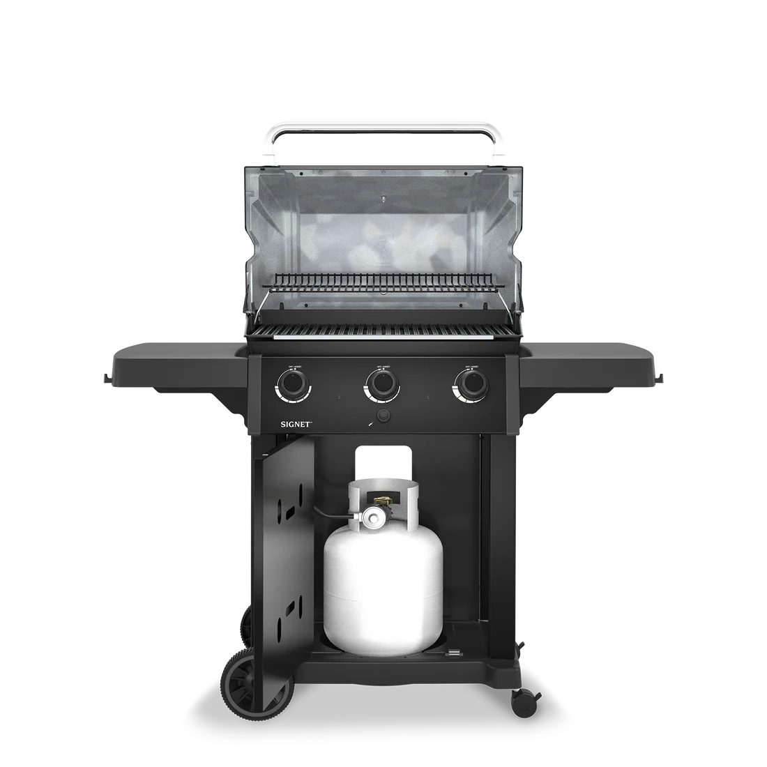 The Signet™ 320 Shadow features 635 sq. in. total cooking space including porcelain coated warming rack, heavy-duty cast iron cooking grids, stainless steel Flav-R-Wave™ cooking system, 3 stainless steel Dual-Tube™ burners, stainless steel drop-down side shelves and enclosed cabinet base.