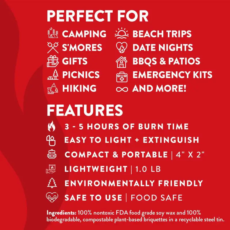 Eco-friendly, 100% non-toxic FDA approved food-grade soy wax, 100% biodegradable, compostable, plant-based briquettes, recyclable steel tin.