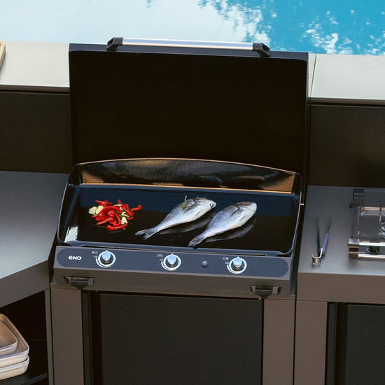 Featuring a thick 1/4" cast iron cooking plate with a lifetime guarantee , this gas griddle ensures even heat distribution, guaranteeing perfect cooking results every time and easy cleaning thanks to its high sides. The power of the three high-efficiency double-ring burners allows for rapid temperature increases up to 680°F for perfectly searing meats, fish, and vegetables.