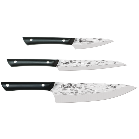 This beautiful set includes everything you need to get cookin'. The 8-inch PRO Chef's Knife is your go-to knife for most day-to-day slicing and dicing tasks. The PRO Paring Knife can be used in-hand or against a cutting board and takes care of everything from hulling strawberries to peeling ginger. And finally, the PRO Utility Knife is perfect for all those in-between sized jobs, like trimming broccoli or green beans.
