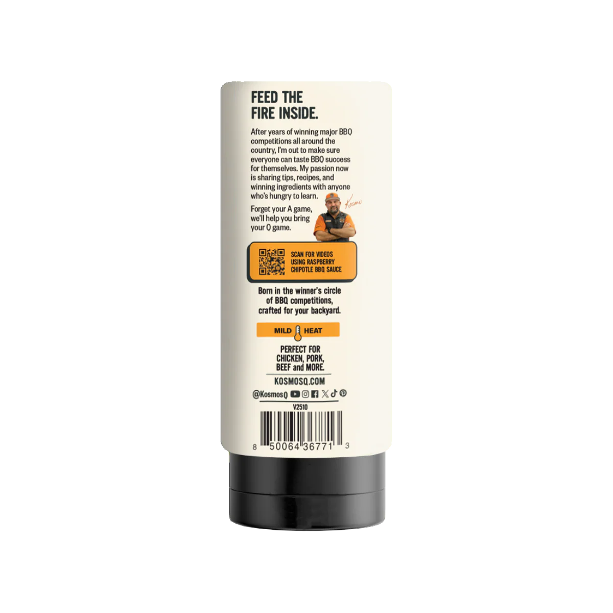 With three different blends of raspberries and just the right amount of kick from chipotle peppers, — this really is the perfect combination for any barbecue. Every Kosmos Q sauce is rigorously tested and improved until it reaches taste bud-quivering perfection, and our Raspberry Chipotle BBQ Sauce is no exception. We spent 18 months making sure we brought the perfect sauce to our customers. Rely on it for any occasion, from barbecue competitions to backyard cookouts, for that extra Q factor people won't be able to stop talking about!