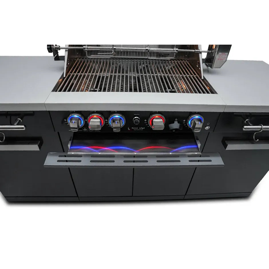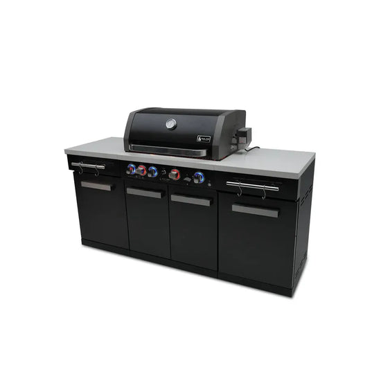 Experience big performance in a small footprint. The Mont Alpi MA-957 features 4 burners, a ceramic rear burner, and elegant black stainless steel construction. Arrives fully assembled with granite countertops and a heavy-duty rotisserie.