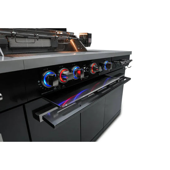 This unit marries the modern sophistication of 304 Black Stainless Steel with the timeless elegance of white granite surfaces. The result is a visually stunning centerpiece that looks more like a high-end indoor appliance than a traditional outdoor grill. The aesthetic is completed by color-changing LED control knobs (Blue for Off / Red for On) and bright internal halogen lights, ensuring your station looks brilliant day or night.