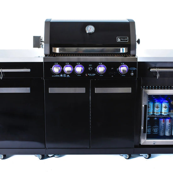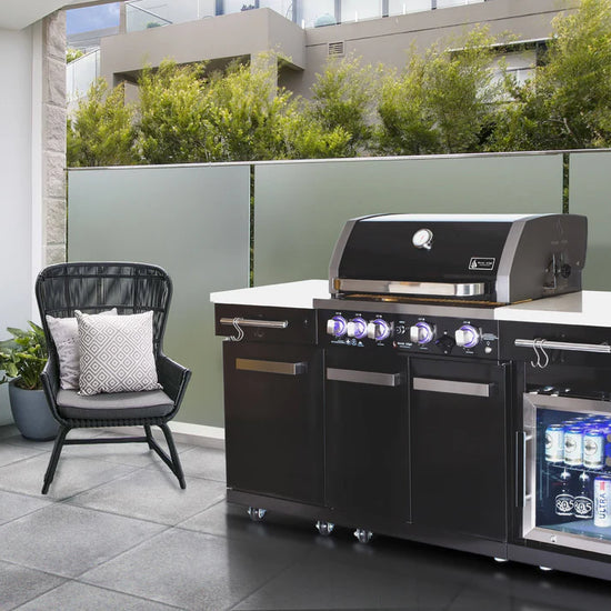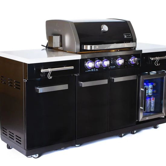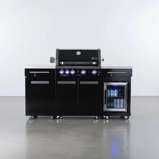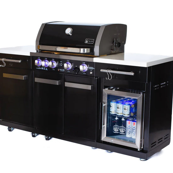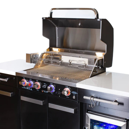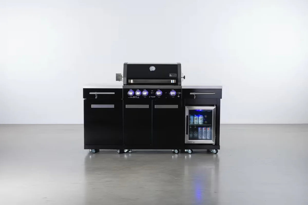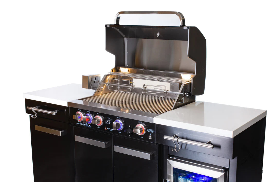 The Mont Alpi MA-957FC elevates the compact series by adding complete cold storage capabilities to your cooking station. Designed for the entertainer who needs an all-in-one solution, this unit combines a high-performance grill with a 1.3 cu. ft. outdoor-rated refrigerator, keeping your ingredients fresh and your beverages ice-cold—all within a modest 70-inch footprint. The striking 304 Black Stainless Steel contrasts beautifully with the white granite surfaces, creating a modern aesthetic that anchors your outdoor living area.
