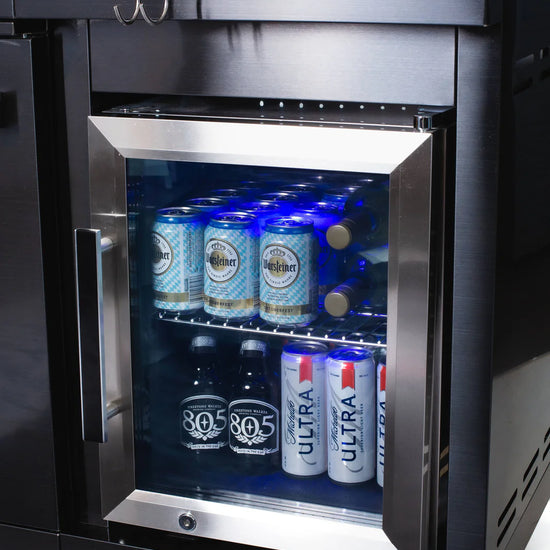 A premium outdoor-rated refrigerator with blue LED lighting. Compact but mighty, keep beverages ice-cold and your ingredients fresh.