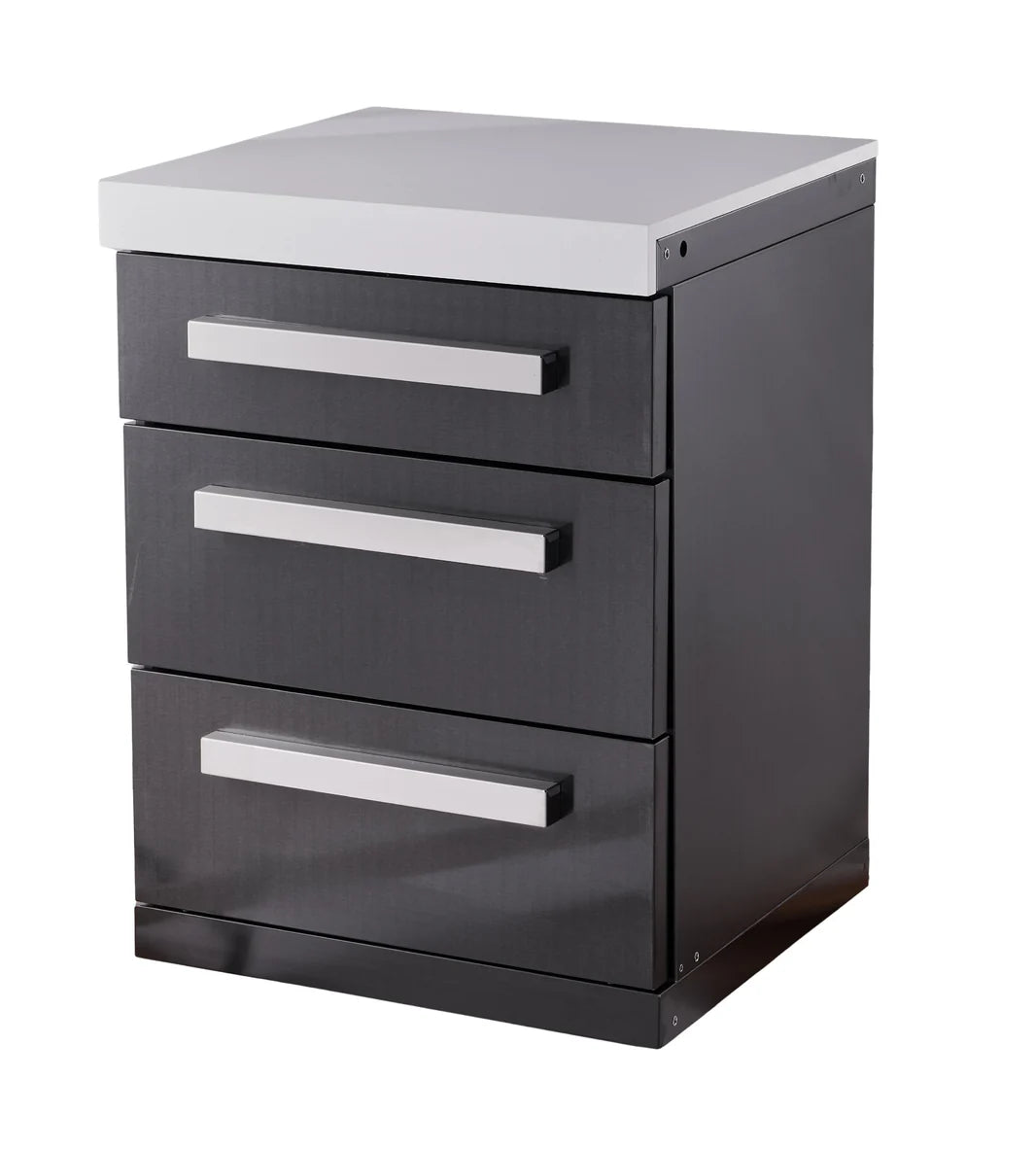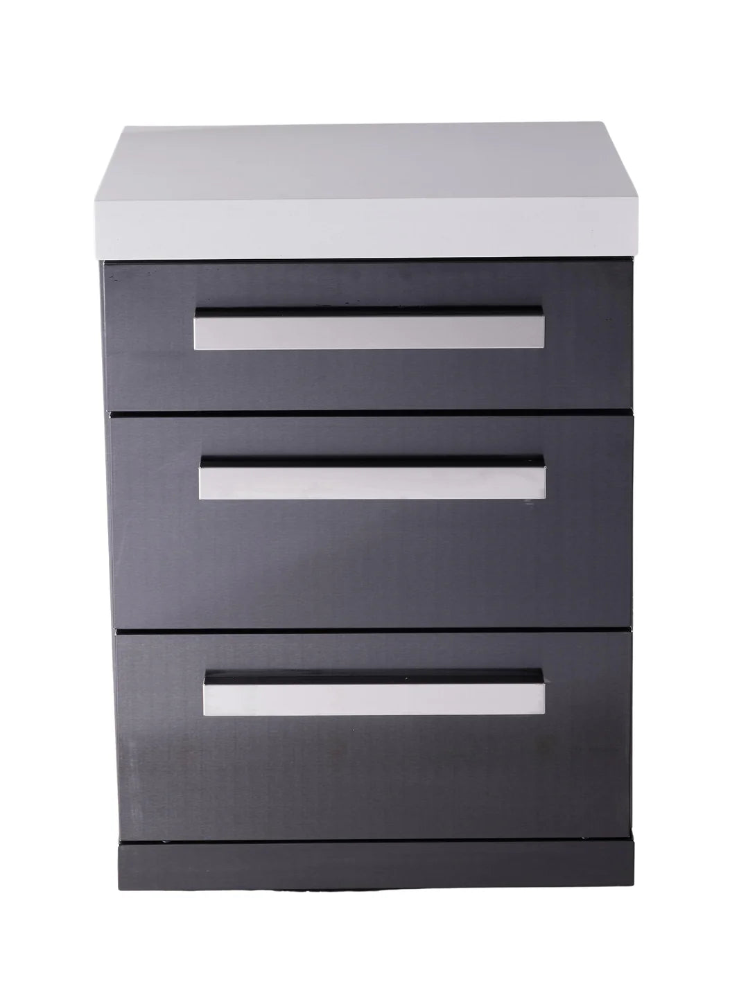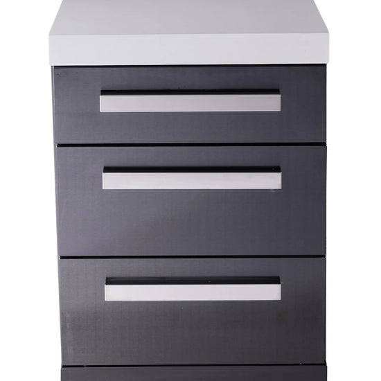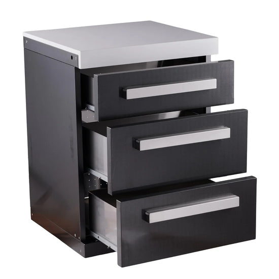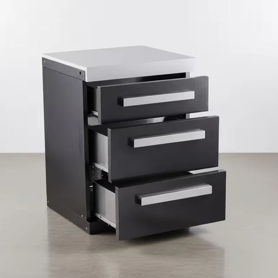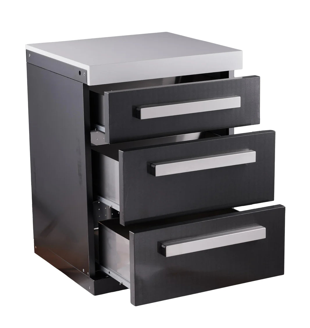 Finished in the signature Black Marine Grade 304 Stainless Steel with a gleaming white granite top, this cabinet matches your grill perfectly. It features soft-close drawers that glide shut silently—adding a touch of indoor luxury to your outdoor space—and sits on heavy-duty castor wheels for easy movement and leveling.