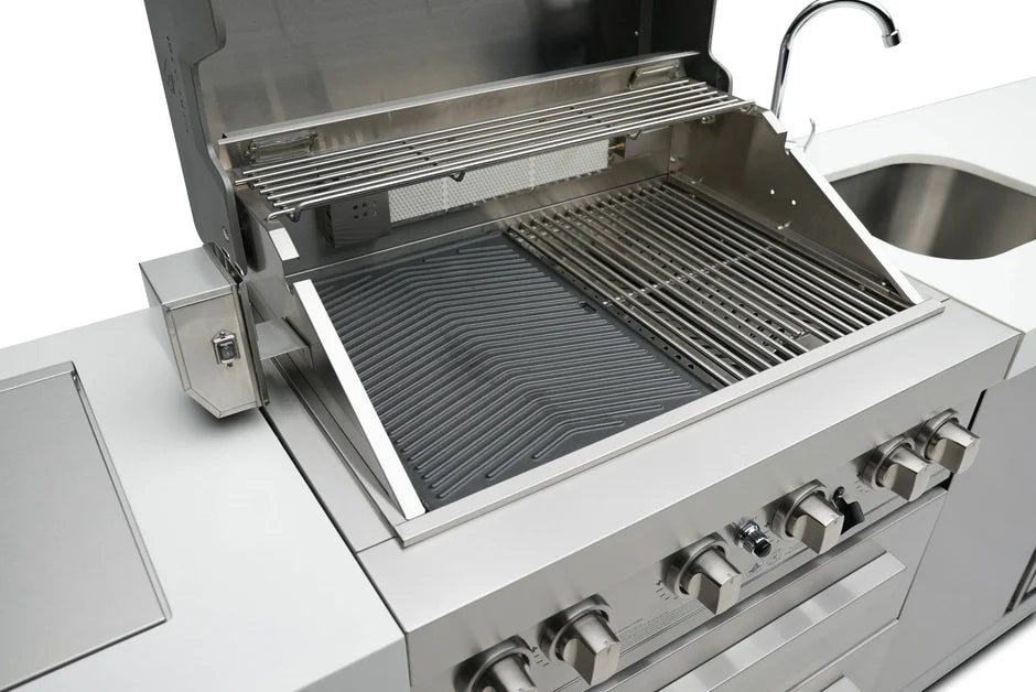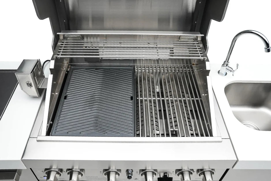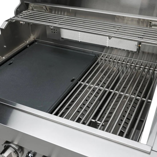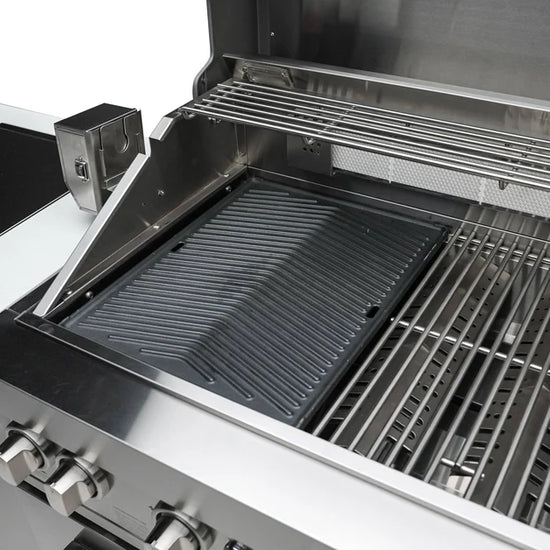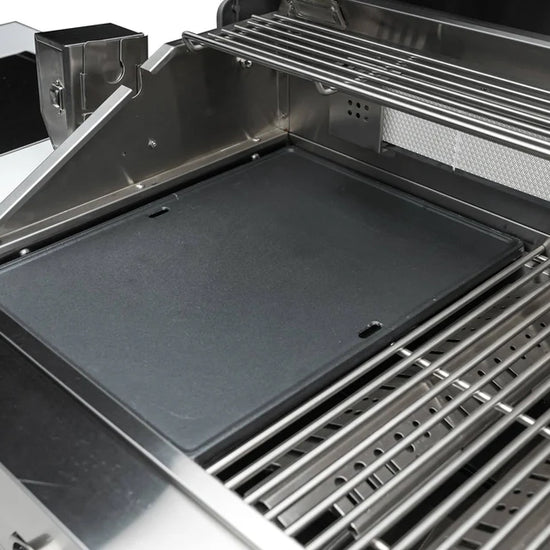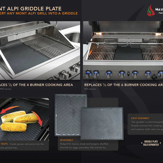 The Mont Alpi Dual sided griddle is specifically designed to fit any Mont Alpi Model, crafted in thick cast iron for heat retention and authentic griddle results. Simply remove a cooking grate and replace with the griddle. The griddle is ridged on one side for Salmon, grilled veggies and other foods that require ripples and sears, the other side is silky smooth for eggs, bacon, tacos and the ultimate smash burger. Turn your grill into a griddle in seconds and enjoy the benefits of flat top cooking on your Mont Alpi Grill.