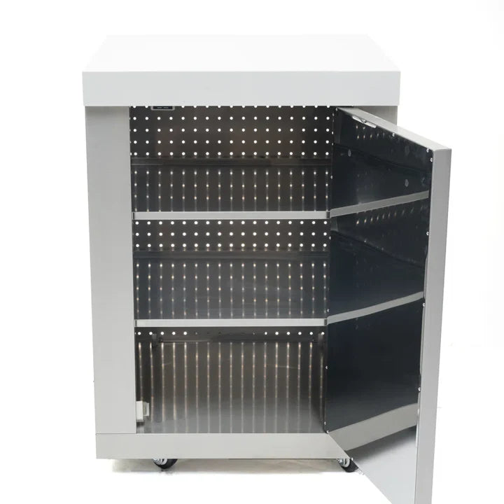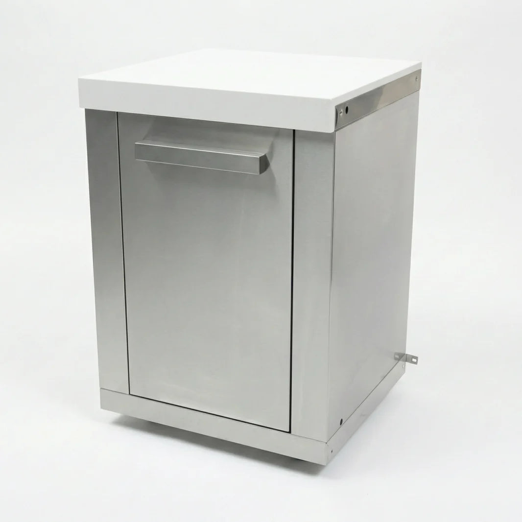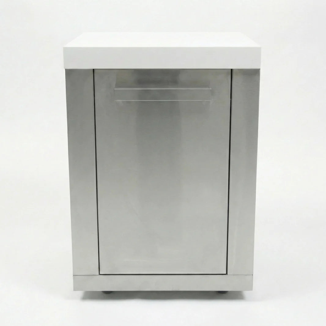 This cabinet features the gleaming Marine Grade 304 Stainless Steel finish, contrasted by a durable white composite granite top. It stands on heavy-duty gliding castor wheels for easy maneuverability and features a spacious interior cabinet to keep your outdoor entertainment zone clutter-free.