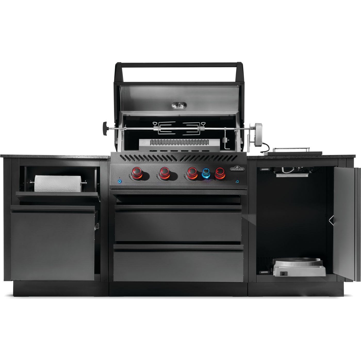 Bask in the luxury of an outdoor kitchen with the wing-shaped OASIS™ 300 Modular Island Kit. Providing the perfect amount of storage and workspace along with the full-sized, 700 Series 32-inch gas grill head. This unit comes with a propane tank storage cabinet that features a rollout for easy propane changes. Each cabinet is built for durability, featuring Matte Black, powder coated, galvanneal. Fully customize this workspace by selecting your own countertop in the material and finish that matches your style. The hard work is already done and all necessary specs are provided. OASIS™ Modular Island Kits are easy to install. There are knockouts for electrical, gas, and water, as well as easy-to-level feet. Create the perfect outdoor kitchen experience with loads of convenient storage and a durable finish that will handle anything the elements can throw at it.