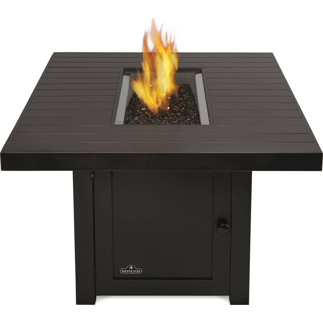 The perfect outdoor living space has a comfortable place to relax, a place to set your drinks and gather around, a place that is the focal point. Napoleon's St. Tropez Rectangle Patioflame® Table is the perfect addition to your outdoor living space. It features a classic, linear design that will match any outdoor decor. The rustic bronze finish gives an antique style, while the linear gas burner adds a modern flair with a ribbon of flame. A stylish glass ember bed reflects the light of the flames warming you and providing a cozy atmosphere. The St. Tropez Rectangle Patioflame® Table puts out 60,000 BTU's of heat providing beautiful dancing flames, and light for your outdoor space. The table itself hides the propane tank behind an easy to access door.