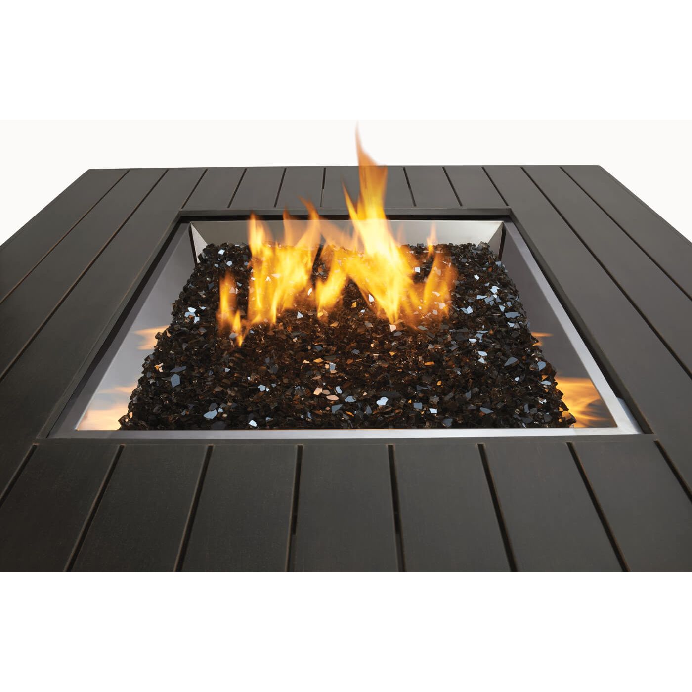 This is the focal point of your relaxation area. The Napoleon St. Tropez Square Patioflame® Table boasts a design that is both elegant and modern, it will match any decor. Finished in rustic bronze and paired with a glass ember bed, provides for a stunning look. It even comes with an aluminum burner cover to turn it into a full table when you're not watching those beautiful flames. Easily light the Square Patioflame® Table and receive 60,000 BTU's of heat, dancing flames, and glittering light for your outdoor space. No need to worry about unsightly fuel lines and tanks cluttering your space. The St. Tropez Patioflame® Table hides the propane tank behind an easy access door.