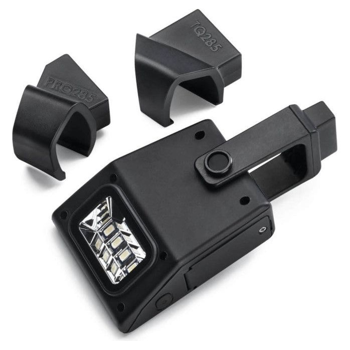 - Sleek design clips onto handle and is easily removable for transport, storage, and battery changes