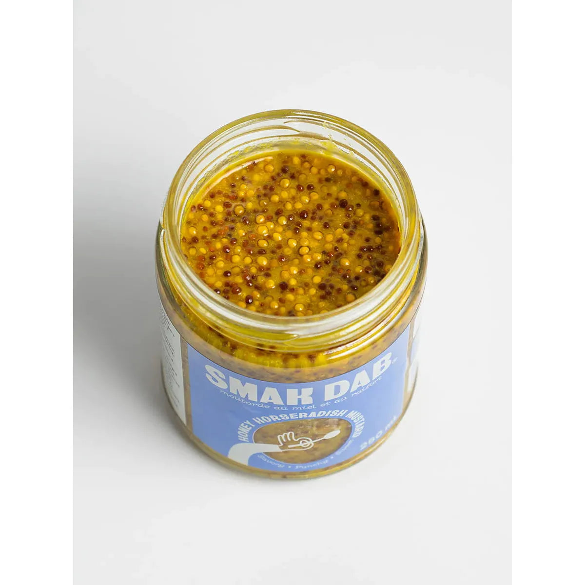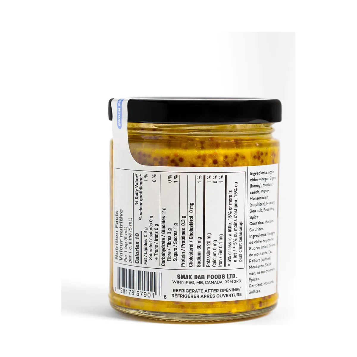 Ingredients: Apple Cider Vinegar, Honey, Mustard Seeds, Water, Horseradish (Sulphites), Mustard Powder, Sea Salt, Seasoning, Spices.