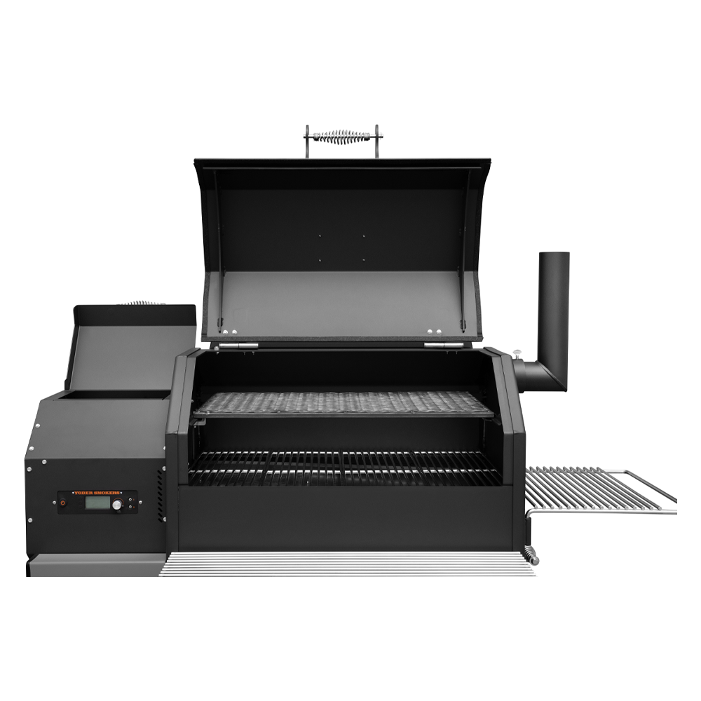 This new cart is fully powder coated in all standard colors. The cart is perfectly paired with fit & finish that is top of mind and constructed from heavy-duty 10-gauge steel. This heavy-duty drawer keeps all your gear and tools within arm’s reach while cooking and provides secure storage until your next cook. Everything from the Yoder Smokers Wood-fired Oven to grilling grates, gloves, cast iron griddle, and more. The drawer is weather and dust resistant conveniently located in the end of cart to keep the front print compact. This competition cart features wire shelves and 8" casters with flat-free tires for markedly more maneuverability, while integrated tie-downs make it easy to secure for travel. Yoder Pellet Grills are built like a tank, just ask any pellet grill owner. The hopper is constructed of 14-gauge steel, while the cooking chamber is constructed of 10-gauge steel. Lift the hood on this grill and you'll quickly understand why this will be your grill for life.